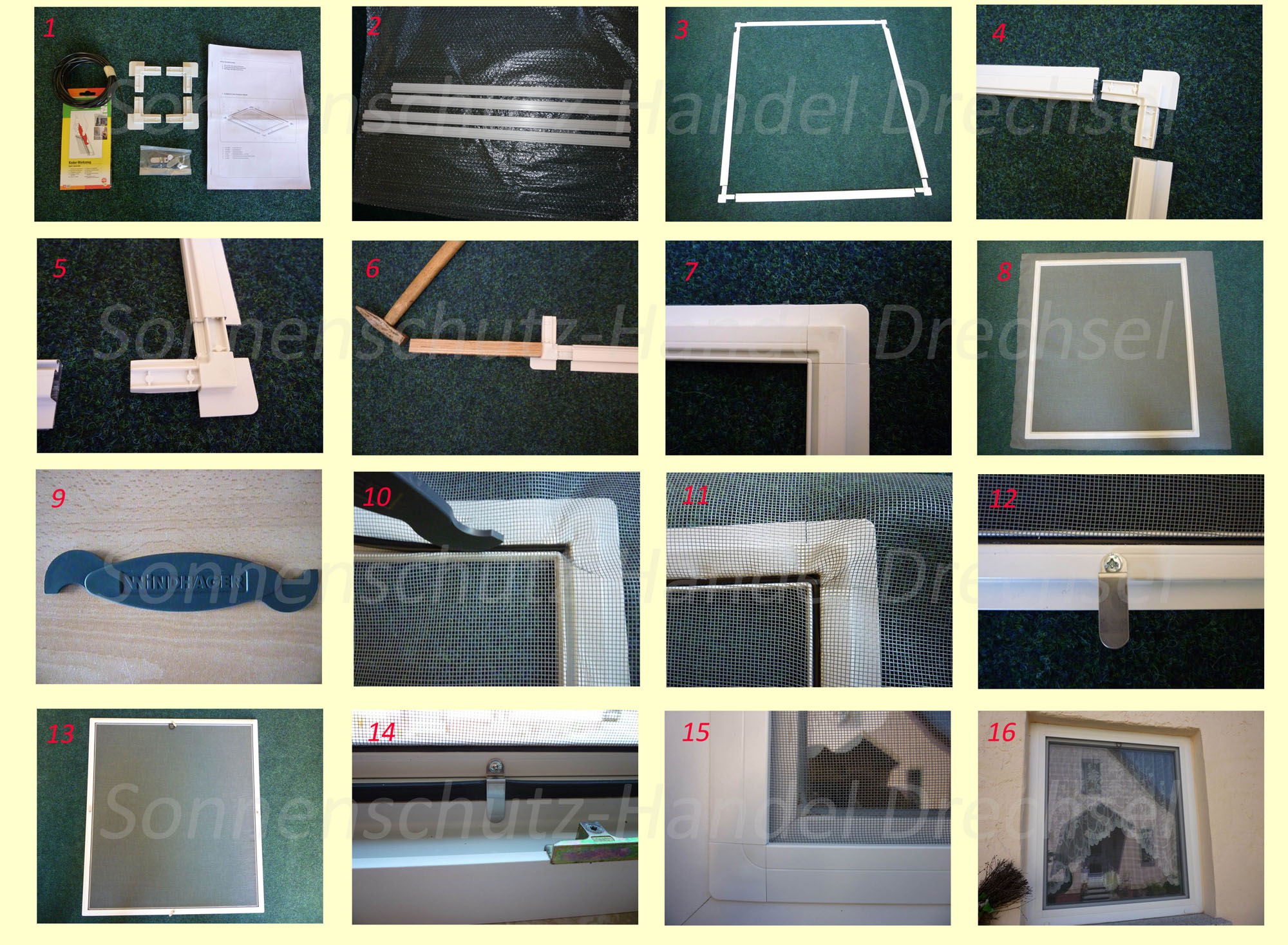 Wie die Einzelteile des Insektenschutzspannrahmens zusammengebaut werden, sehen Sie auf nachfolgenden Bildern.